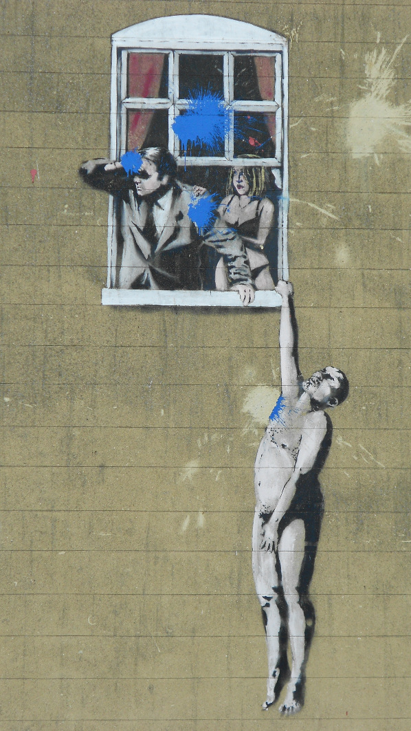 From the harbourside, head towards Park Street. Banksy's artwork Well Hung Lover– a naked man hanging from a window – is actually on the side of a sexual health clinic on Frogmore Street, but the best views are from the bridge at the bottom of Park Street that crosses over Frogmore. The Bristol Museum and Art Gallery is at the top of Park Street, and Banksy's sculpture Angel Bust, a statue of an angel with a paint pot on her head, can be seen in the main foyer.