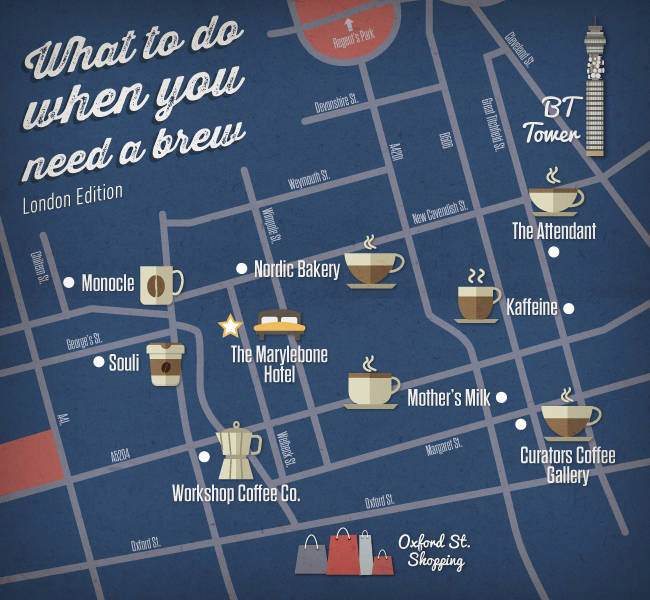 Our handy map highlights some of the finest cafés in the city. Partaking in a spot of retail therapy on Oxford Street? Be sure to check out the nearby Workshop Coffee Co., an intimate coffee bar whose focus is on quality and simplicity. If you’re peckish, head to Nordic Bakery on New Cavendish Street – just be sure to sample their amazing cinnamon buns. Or, if you fancy taking a load off and relaxing in luxurious surrounds, make your way to 108 Brasserie at The Marylebone Hotel. Here you can sample coffee, pastries, cakes and even a decadent Afternoon Tea if you’re feeling particularly lavish. There’s also a host of tasty gluten-free treats on offer if you fancy a healthier alternative.