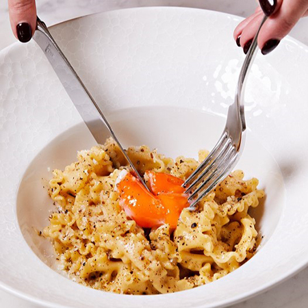 A harmonious blend of light and creamy, Chef Christian says this dish marries the peppery kick of cacio e pepe with the lusciousness of carbonara. Featuring parmigiano fondueca, a four-pepper blend, garlic-herb crumbs, and a silky egg yolk, it’s a perfectly balanced indulgence.