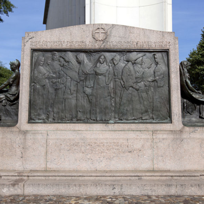 The Nuns of the Battlefield Monument is a bronze statue located in Washington, D.C.'s Catholic University of America. It was designed by Irish-born sculptor Jerome Connor, who was also responsible for several other prominent works of art in the city. The monument was commissioned by the National Order of Sisters of the Holy Cross in recognition of the contributions made by Catholic nuns during the American Civil War. Connor's design depicts three nuns in traditional habits tending to a wounded Union soldier, with a fourth nun looking on in prayer. The statue was unveiled in 1924 and remains an important symbol of the role played by women in the Civil War.