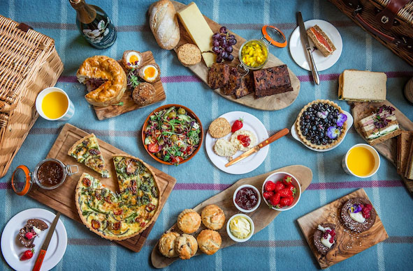 Picnic menu highlights include a summery selection of freshly cut sandwiches, savory bites and pastries and a refreshing chopped Mediterranean salad with feta and pomegranate. It also includes picnic classics such as British cheddar with oatcakes and chutney, an indulgent assortment of cakes and summer deserts and Devonshire scones with al the trimmings. It also comes equipped with a bottle of Nyetimber sparkling wine and all the picnic essentials including a rug, cutlery, glasses and condiments.
