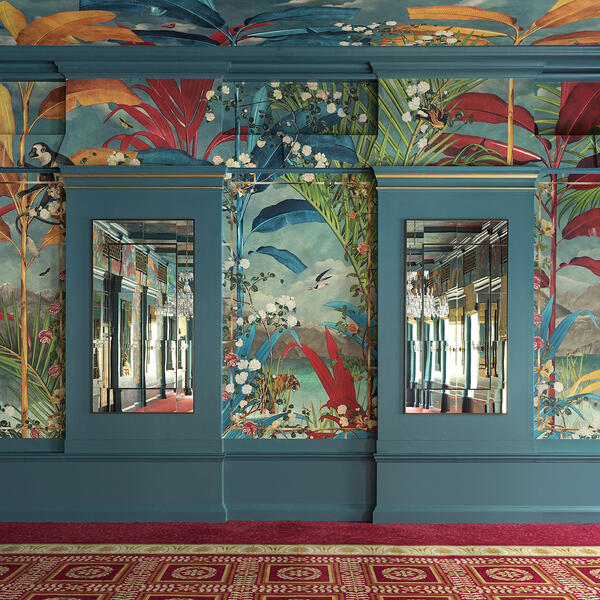 This Autumn, The Bloomsbury hotel reopens the doors to it’s grand George V ballroom. Inspired by the extensive travels of HRH George V during the expansion of the British Empire, the room has been renovated as a homage to the monarch’s love of travel. Striking Adam Ellis wallpaper encompasses the room, depicting a lake scene with tropical botanicals and an assortment of creatures from all corners of the globe.