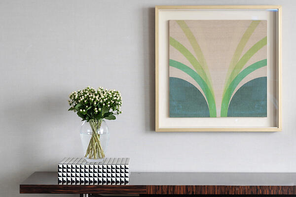 There’s another Irish legend in the room. Fount, a silkscreen by artist Patrick Scott, hangs above a mid-century Italian console table with Art Deco detailing. Scott was famous for using gold leaf in his works but he wasn’t one to talk about it. When pressed, he said that he “liked the look of it.” In 2021, the Irish postal service, An Post, marked the centenaryof Scott’s birth with a series of postage stamps of his gold paintings.
