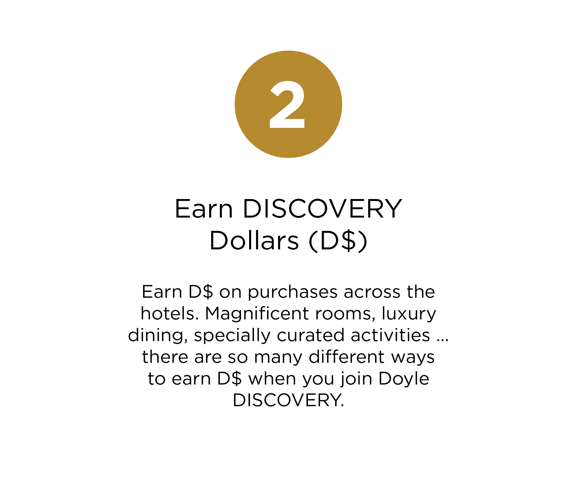 Introducing DISCOVERY Dollars (D$) - our exclusive rewards currency available from day one. Effortless to earn, and yours to spend however you choose. What are D$? Upon joining Doyle DISCOVERY, you'll start receiving a percentage back on all eligible purchases, ranging from 4% to 7% in D$ every time you visit one of our hotels*. D$1 amounts to USD 1, so the value is clear. And keeping track of your balance is simple and easy on the all-new DISCOVERY app and website. How do D$ work? As a member, you'll automatically start earning from day one on stays and purchases in any of our hotels*. At check-out, simply put your D$ towards your bill to help pay for your treats and indulgences. It’s that simple! What can you spend D$ on? We believe in celebrating life and delighting in every invaluable moment. That’s why your D$ are yours to spend however you like — so you can choose how you want to relish your precious time. Spend D$ across our hotels, from rooms to dining, spa, golf and Experiences. Or save up for your next dream getaway. Treat yourself to an opulent room upgrade, go for that decadent vintage at dinner, get the massage and facial or explore your location with a curated Experience … there are countless ways to spend your D$. |