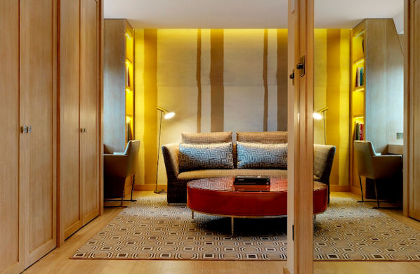 You step into The Marylebone Suite, met straight away by gorgeous design pieces like an Ostrich feathered lamp, candles set into stone and huge plump sofas. Fresh flowers and fruit are on the table, along with a chilled bottle of Champagne.