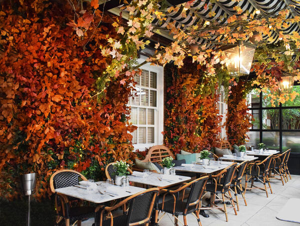 Stylish and full of character, Dalloway Terrace is the perfect hideaway on a wet day in London. Just a 2-minute walk from Tottenham Court Road station, the restaurants new autumn installation is an enchanting spot for dinner and a drink amongst the foliage adorned walls, elegantly created by London florist, Wild at Heart.