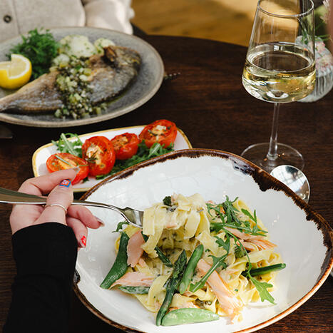 Fine dining seafood at The River Grille, The Bristol hotel. A dish of salmon pasta and a separate serving of seabass are presented, accompanied by a glass of wine.