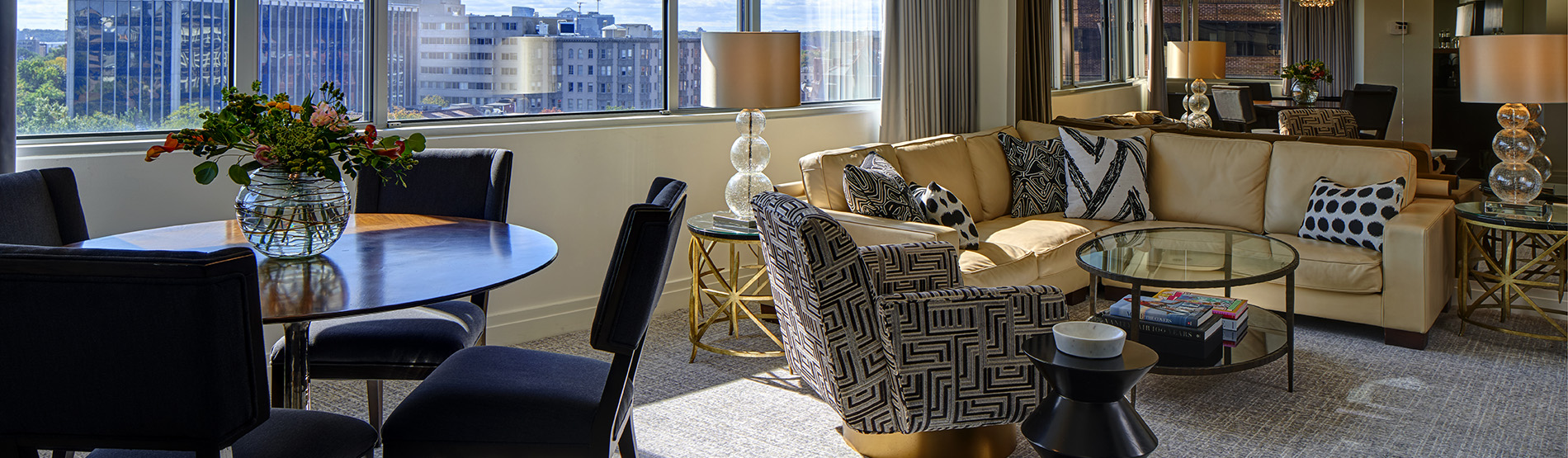 For those traveling with family or in need of extra space, our Parkview Suites on the 8th floor offer the perfect solution at The Dupont Circle. Conveniently located just off the elevator, these expansive 750 to 800-square-foot suites provide ample room to stretch out, featuring spacious living areas, dining tables, and breathtaking views of Dupont Circle Park. For larger groups, the two suites can be seamlessly combined via an inner door to create a generous 1,600-square-foot space, ideal for multigenerational families or gatherings with friends.