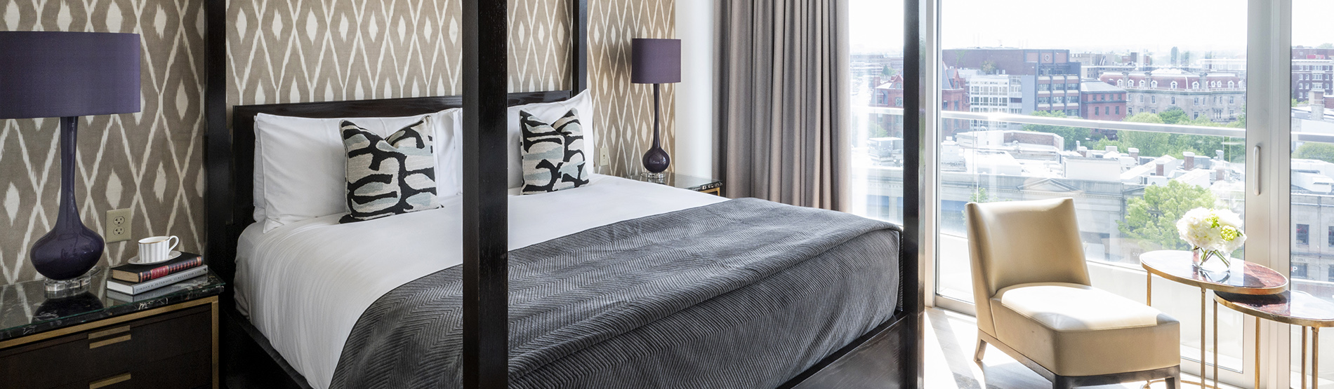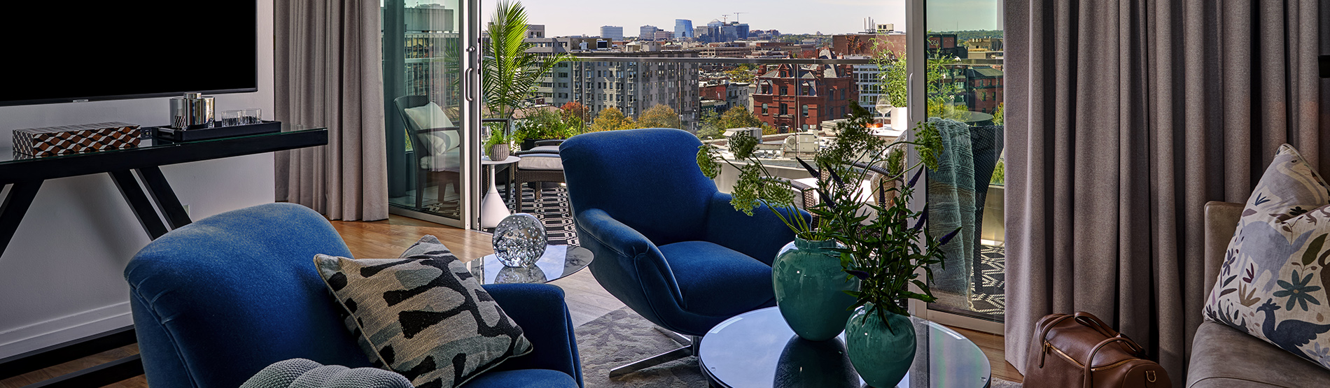 For those who crave a connection to Washington, D.C.’s iconic skyline, our Signature Terrace Suite offers just that. This two-room, 600-square-foot suite opens into a chic living room with direct access to a private terrace—your own personal sanctuary complete with sun loungers. Soak in the views of the National Cathedral and enjoy the local art, including a stunning painting of Dupont Circle Fountain by Howard Carr. Whether you’re here for work or leisure, this luxury hotel suite invites you to unwind in comfort and style at The Dupont Circle.