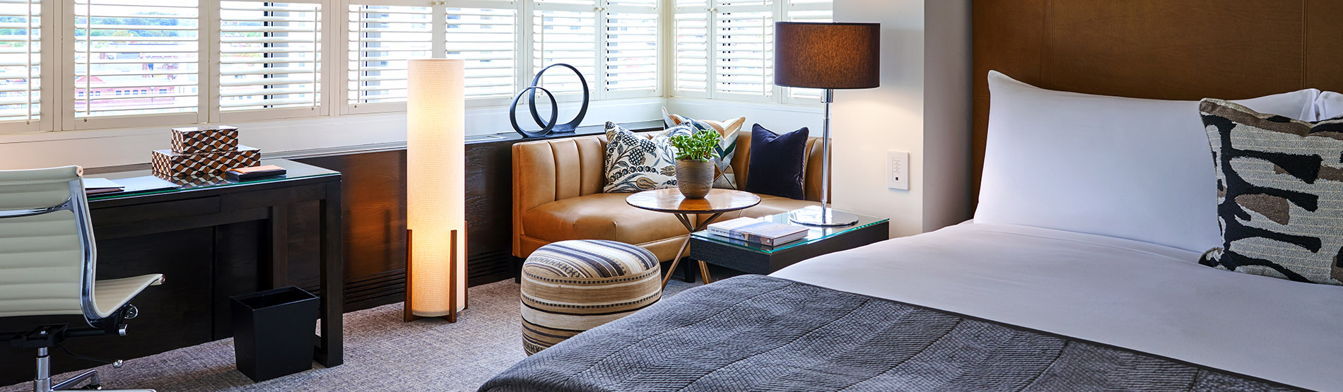 Alternatively, the north-facing suites at the back of the hotel provide a more tranquil experience, overlooking a peaceful residential street. These corner rooms are designed for those who appreciate quietude. This family-friendly suite features elegant wood shutters that lend a homey feel, while the blackout shades cater to those sensitive to light, ensuring the perfect setting for a restful night’s sleep.