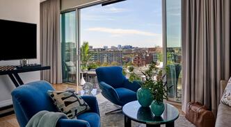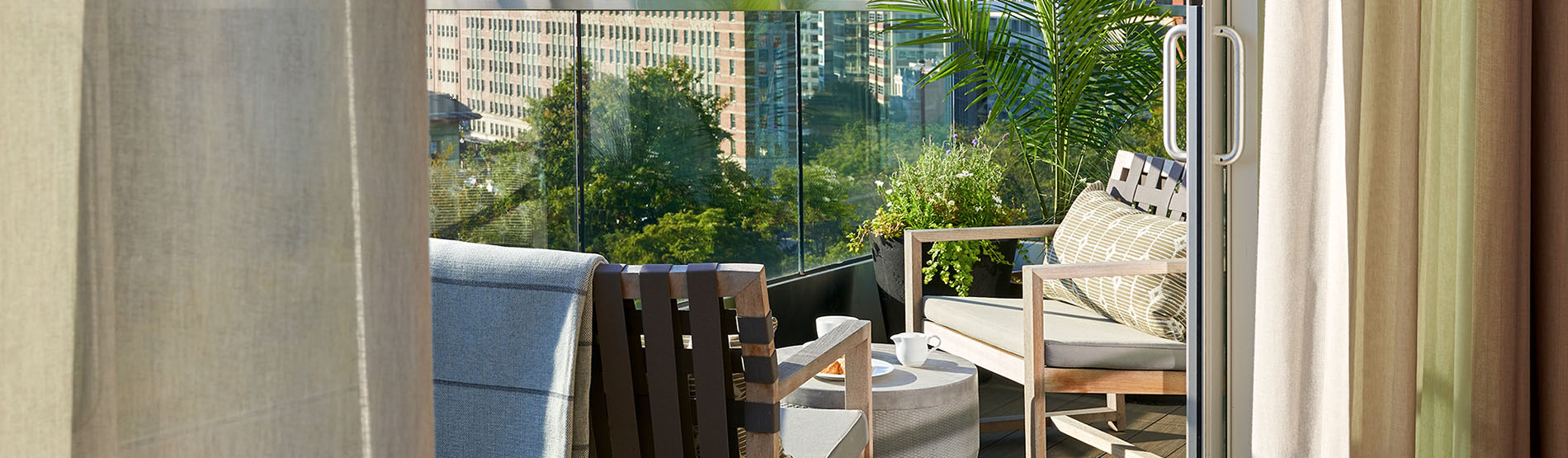 Our Luxury Terrace Suites offer the perfect blend of comfort and refinement at The Dupont Circle. Step into the spacious living room adorned with captivating photography by David Hilliard and elegant paintings by Howard Carr, creating an inviting atmosphere for relaxation. Adjacent, a separate, serene bedroom awaits, ensuring a restful night’s sleep. Outside, the private terrace offers stunning views of the city, including the iconic Washington National Cathedral—an ideal spot to unwind with a glass of wine and admire the distinctive skyline of Washington, D.C.