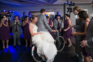 They got the party started quickly, with a ballroom surprise inspired by a ‘90s one-hit wonder. “Our entrance was unforgettable! After moving all the guests into The Dupont Circle Ballroom, the band started the beat of the Proclaimers’ ‘I’m Gonna Be (500 Miles)’ as they introduced the wedding party, who lined the dance floor in the center of the room,” Alli recalls. “When Greg and I were announced, he pushed off and I hopped onto the back of his bike for a shaky ride into the room and onto the dance floor! After successfully navigating the entry, we passed off the bike to the Best Man and began our first dance. The band sang revised lyrics -- ‘I would bike 500 miles/ And I would bike 500 more..’ -- as we danced. About a minute into the song, our wedding party joined us as a chorus line, complete with high kicks and hand rolls. All of our guests were smiling and energized as we did our final ‘da da DA da’ before sitting down to the first course.”