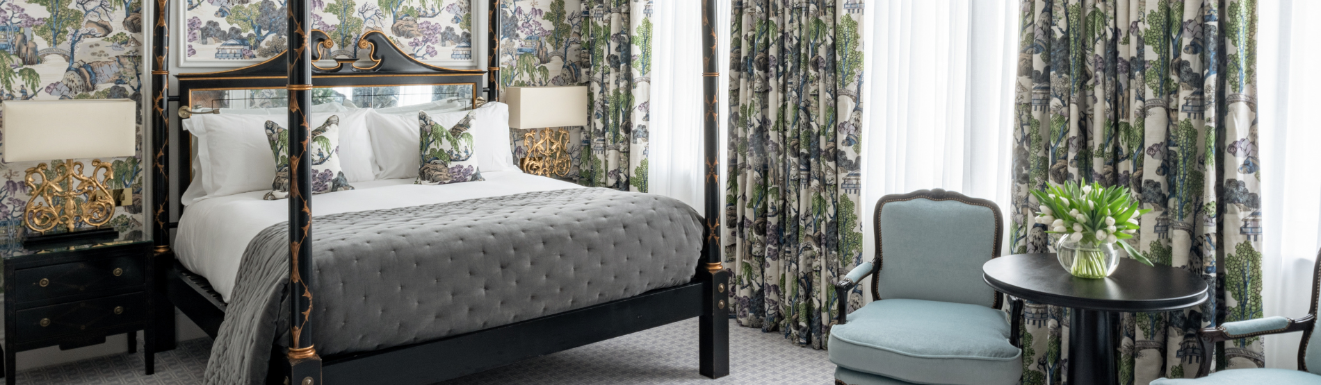Perfect for families or groups, this versatile suite offers four poster beds, unique furniture and carefully curated art pieces which have been hand-selected to compliment the palettes. For added flexibility, this London hotel suite offers the option to connect with a second room.