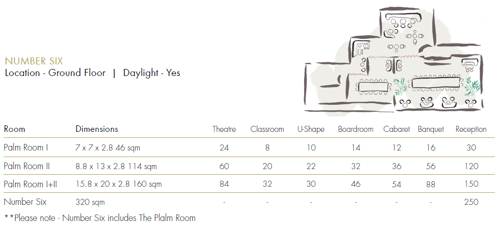 Number Six is an event space boasting its own private entrance, bar and elegant lounge, evoking a members’ club feel. It can be broken into two smaller areas, while a stylish, heated terrace with monochrome tiles and verdant backdrop provides the perfect calming escape in central London.
