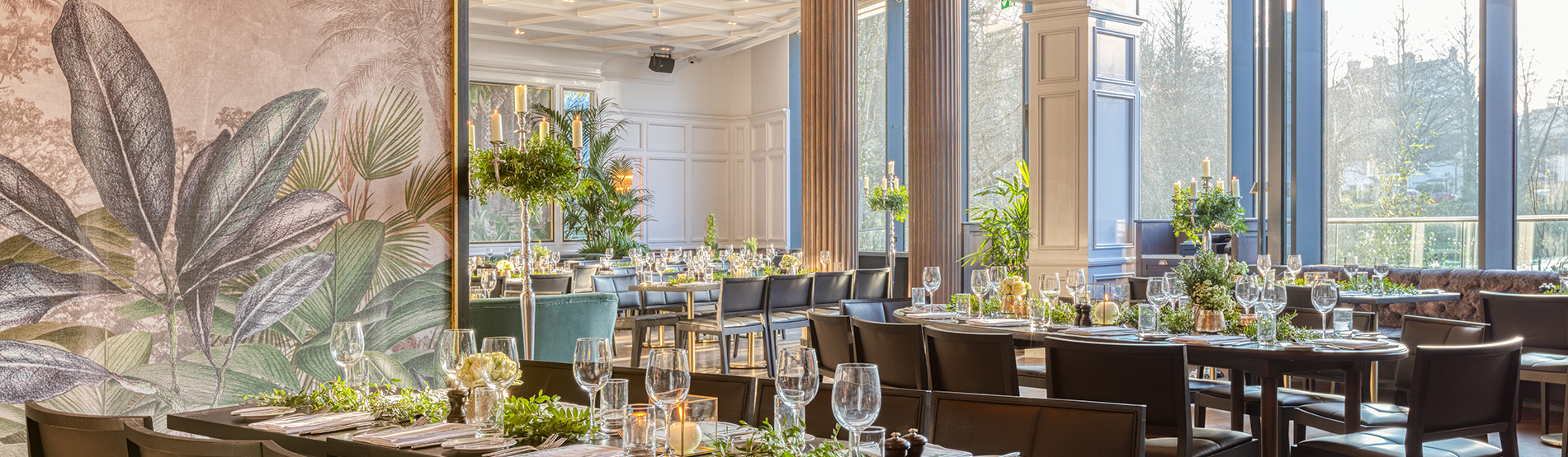 Set on the River Lee, with beautiful signature touches - a hand-crafted mahogany bar, imposing gilt-edged mirrors, luxurious Italian wall hangings, mid-century German Chandeliers and plush velvet seating, this space comfortably seats 100 and can accommodate up to 150 for more informal events.