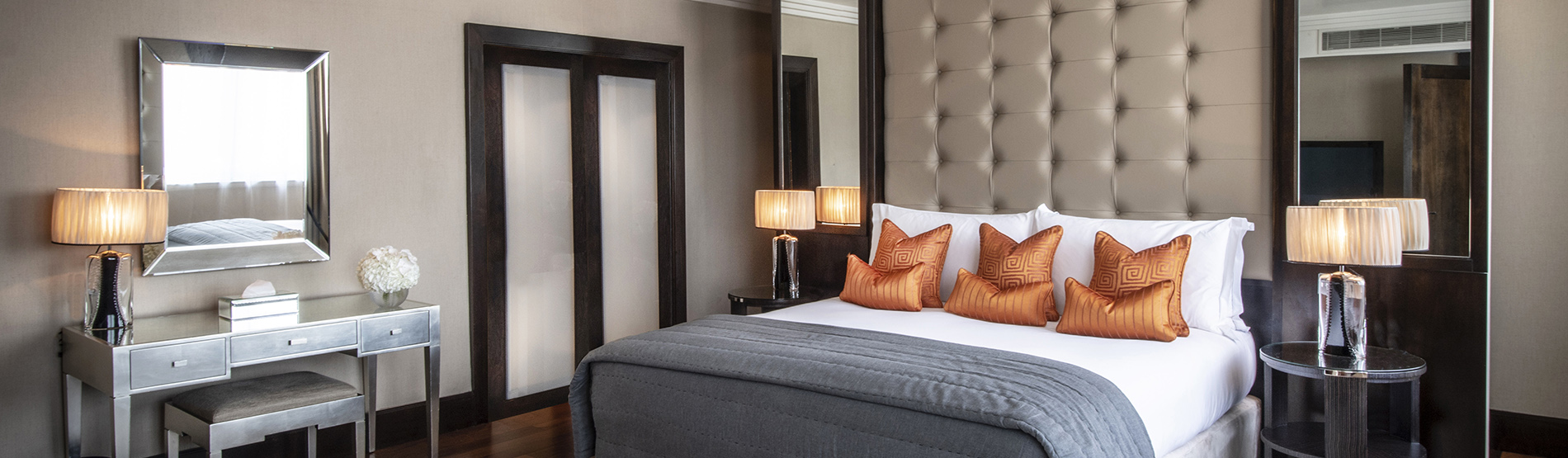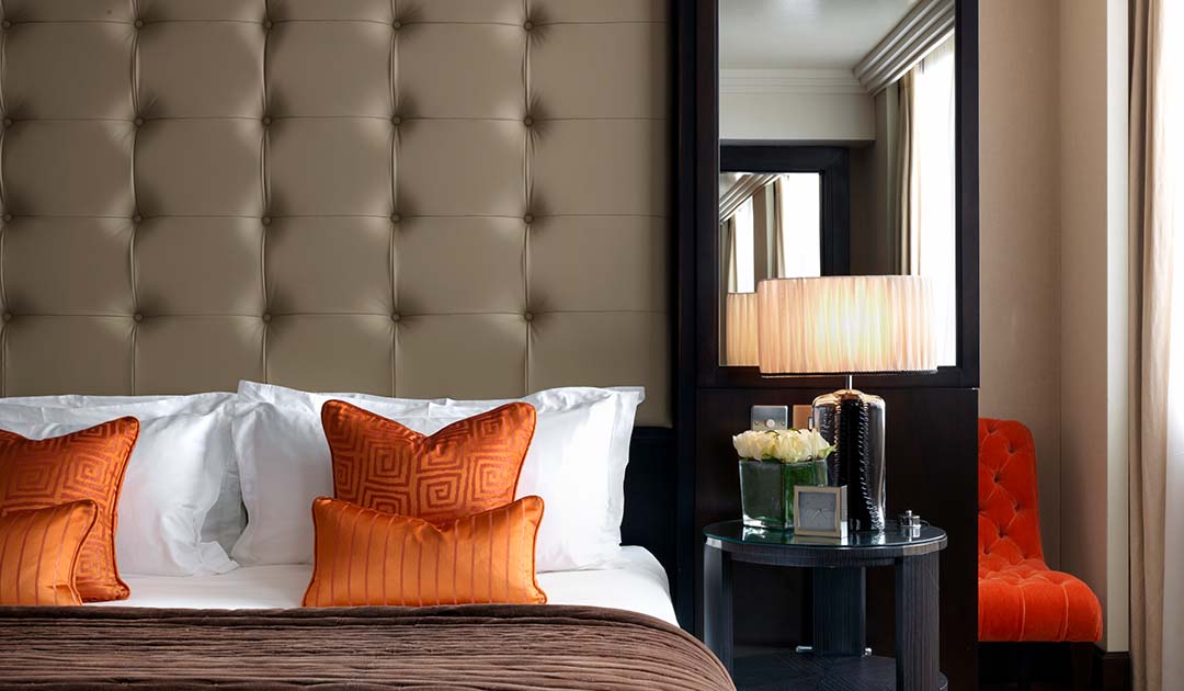 Artwork from some of Ireland’s most celebrated artists adorn every wall, thoughtfully curated and complemented with finely crafted furniture and furnishings. The design scheme was created around the suite’s centrepiece, a bespoke rug featuring mid-century motifs. The colour palette adopts a series of warm tones featuring bright green accents with large organic forms flowing through the rug.