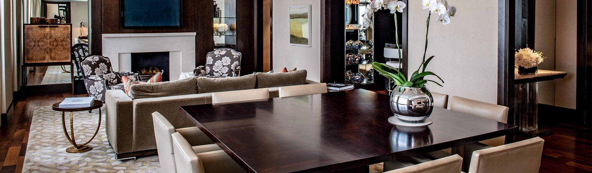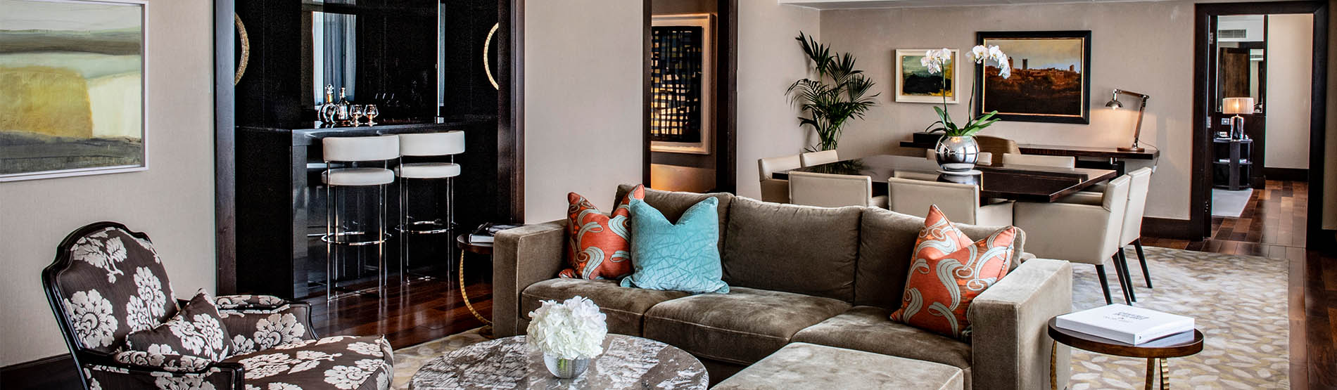 The P.V. Doyle Suite occupies a secluded wing of the hotel, and features a spacious master bedroom, living room and dining area alongside a fitness and wellbeing space. Windows fill the space with natural light, reflecting on the glamorous cut-mirror fronted and brass-lined cocktail bar, which transforms at night into the perfect space for entertaining.