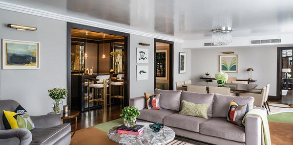 The P.V. Doyle Suite occupies a secluded wing of the hotel, and features a spacious master bedroom, living room and dining area alongside a fitness and wellbeing space. Windows fill the space with natural light, reflecting on the glamorous cut-mirror fronted and brass-lined cocktail bar, which transforms at night into the perfect space for entertaining.